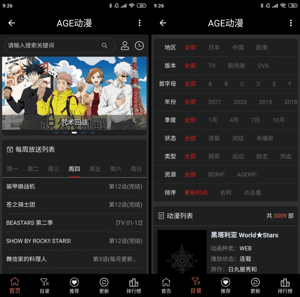 有专门的的动漫更新库,可以查看最近更新的动漫情况,排行榜功能也很齐全,《海zei王》《进击de巨第三季》等都有。